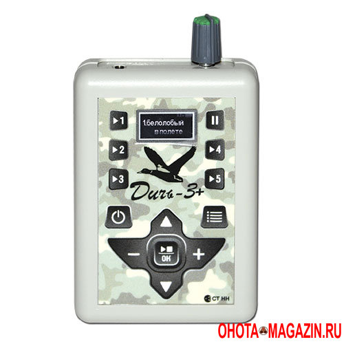 Электронные манки серии "Дичь" отличаются мобильностью и стильным дизайном, новая "Дичь 3+" – не исключение. В корпус новой модели встроено удобное цифровое управление, 5 кнопки быстрого вызова голосов, LED дисплей-который словами выведет название голосов. Плавные линии корпуса и великолепное цветовое оформление, сочетающее черный и серый цвета, придают устройству впечатляющий внешний вид.