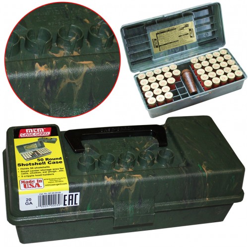 Кейс на 50 патронов для гладкоствольного оружия MTM Shotshell Case позволяет компактно хранить и перевозить боеприпасы. Кейс MTM Shotshell Case используется для патронов гладкоствольного оружия с калибрами 12, 16 и 20. Кейс MTM Shotshell Case вмещает 50 боеприпасов в индивидуальных ячейках для удобства быстрой подачи при стрельбе или при снаряжении патронов. Кейс MTM Shotshell Case подходит для хранения патронов длинной до 76 мм. капсюлями вверх. Кейс MTM Shotshell Case обладает удобной ручкой и пластиковой защелкой, а в центре есть небольшое отделение для хранения вещей, например дульных насадок для ствола оружия (чоков). Крышка кейса MTM Shotshell Case сверху оборудована 5 отверстиями для патронов - быстрая подача патронов при закрытом кейсе на охоте или тренировке.