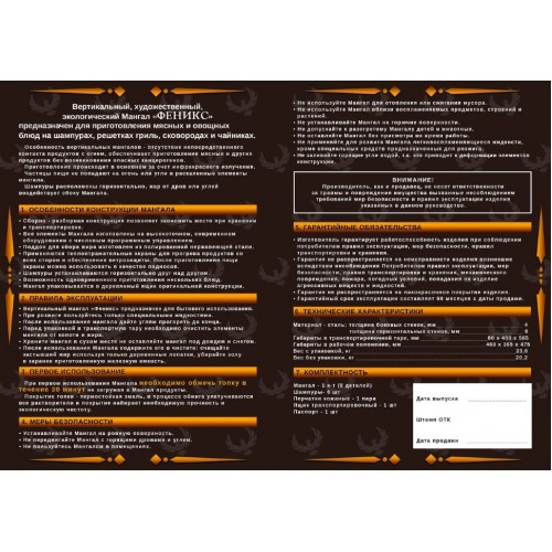 Мангал вертикальный ФЕНИКС с уникальным дизайном конструкции предназначен для приготовления мясных и овощных блюд на шампурах, решетках гриль, сковородах и чайниках. Особенность вертикальных мангалов - отсутствие непосредственного контакта продуктов с огнем, обеспечивает приготовление мясных и других продуктов без возникновения опасных канцерогенов. Приготовление происходит в основном за счет инфракрасного излучения. Частицы пищи не попадают на огонь или угли и раскаленные элементы мангала. Шампуры расположены горизонтально, жар от дров или углей воздействуют сбоку Мангала.