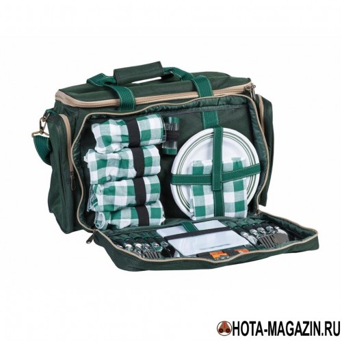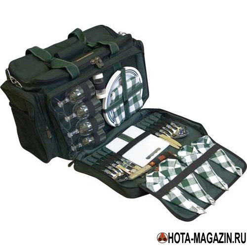В комплекте | 4 бокала, 4 тарелки, 4 ложки, 4 вилки, 4 ножа, штопор, солонка-перечница, скатерть, 4 салфетки, разделочный нож, разделочная доска, сумка с термоотделением |