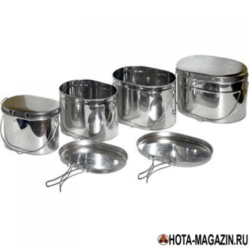 Практичный набор котелков из нержавеющей стали. В набор входит четыре котелка с крышками, снабженными ручками, что позволяет их использовать как сковородки. Объём котелков: 2,2; 3,5; 4,5; 6 литров. Ориентировочно на группу 5–6 человек. Набор упаковывается в чехол. Изготовлен из нержавеющей стали AISI 304.