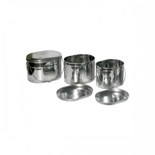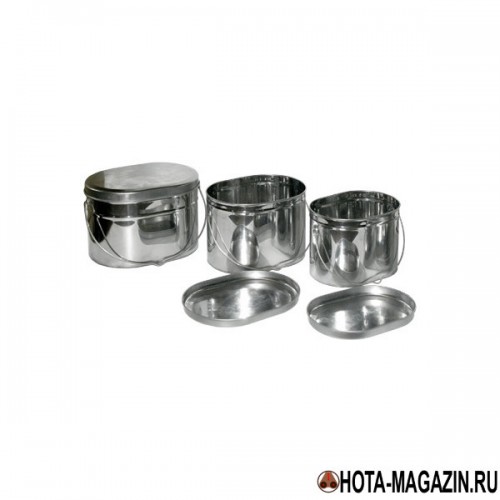 Практичный набор котелков из нержавеющей стали. В набор входит три котелка с крышками, снабженными ручками, что позволяет их использовать как сковородки. Объём котелков: 7,5; 9,5; 12,5; литров. Ориентировочно на группу 6–15 человек. Набор упаковывается в чехол. Изготовлен из нержавеющей стали AISI 304.
