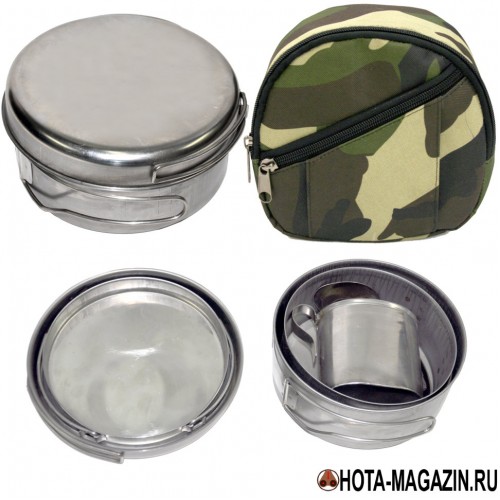 Набор посуды для похода Офицерский состоит из 2 круглых котелков объемом 1,2 литра и 1 литр (без крышки), кружки объемом 4 мл. и ложки. Котелок 1 л. (без крышки) диаметр внутри 146 мм., высота 60 мм. Котелок 1,2 л. (с крышкой) диаметр внутри 160 мм., высота 70 мм. Крышка диаметр внутри 170 мм., высота 30 мм. Котелки и ложка изготовлены методом холодной штамповки. Кружка сварная, сварка выполнена в аргоновой среде без применения электродов или флюсов. Общий вес набора посуды для похода Офицерский 1,15 кг., материал – нержавеющая сталь AISI 304, диаметр 20 см., высота 9 см. Набор посуды для похода Офицерский упаковывается в чехол с молнией. Крышка с боковыми ручками может использоваться как сковородка.