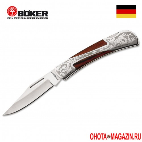 Нож складной с фиксатором BOKER Magnum Grace II для ценителей красоты в простом изящном исполнении с рукоятью из стали с вставками из дерева и травлением декоративного узора на металле. Клинок из нержавеющей стали 440A с надежным фиксатором Back Lock.