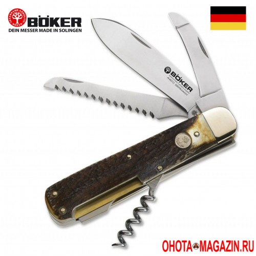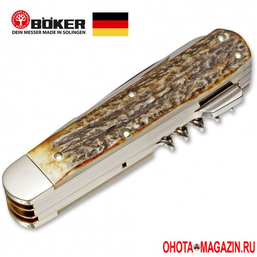 Нож складной с фиксатором BOKER Manufaktur Solingen Jagdmesser Quadror продолжает радовать традициями привычного многофункционального ножа для охоты. Классические вставки из рога на рукояти придают исключительный шарм ножу BOKER Manufaktur Solingen Jagdmesser Quadro, благодаря которым кажды нож является индивидуальным изделием с неповторимой формой - кажды произведнные нож уникальный шедевр в коллекции ценителей ножей. Нож складной с фиксатором BOKER Manufaktur Solingen Jagdmesser Quadro оснащен основным лезвием 440C, пилой, дробилкой и штопором.