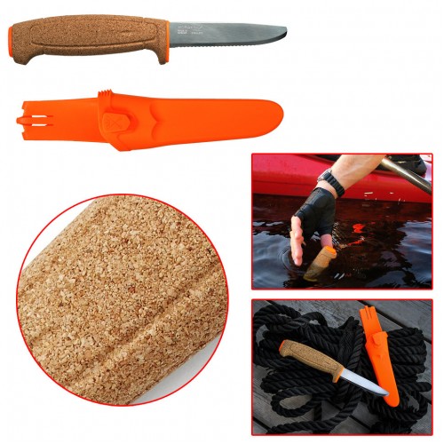 Плавающий нож Morakniv Floating Serrated не тонет в воде благодаря рукояти из пробки. Плавающий нож Morakniv Floating Serrated обладает яркой оранжевой расцветкой Hi-Vis, позволяющей его легко и быстро найти на любом ландшафте и поверхности воды. Плавающий нож Morakniv Floating Serrated с безопасным закругленным клинком (удобно в надувных лодках, защищает от травм) и кромкой лезвия в виде пилы (легко справляется даже с толстыми веревками для альпинизма и тросами). Плавающий нож Morakniv Floating Serrated создавался для областей использования ножа в условиях высокой степени защиты от утери ножа в воде: рыбная промышленность, путешествия в условиях экстремального выживания вдали от цивилизации (сплав, яхтинг, охоты, туризм, рыбалка и другое). Плавающий нож Morakniv Floating Serrated снабжен клипсой на ножнах для фиксации на ремне и краях одежды.