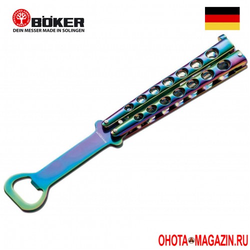 Складная открывашка-бабочка BOKER Magnum Rainbow Balisong оригинальный вариант для открытия пробки бытылки и тренировки перед использованием ножей-бабочек. В закрытом виде выглядит очень похоже на нож с ситемой складывания бабочка. Специальное покрытие хамелеон преливается всеми цветами радуги. Длина 21 см., вес 137 грамм.