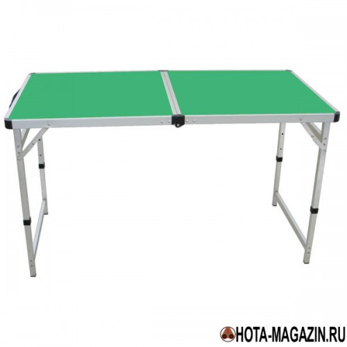 Легкий складной стол цвета зелени с алюминиевым каркасом и регулировкой по высоте. Столешница стола изготовлена из прессшпана и покрыта меламином, который не боится влаги и механических повреждений. Стол легко раскладывается и складывается, регулируется по высоте и компактно транспортируется в чехле, который идет в комплекте
