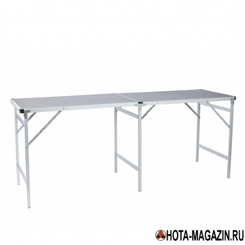 Складной стол для большой компании! Изготовлен из алюминия и снабжен практичной столешницей из прессшпана с покрытием из серого меламина. Благодаря меламиновому покрытию, стол можно мыть и не бояться за его поверхность. Максимальная нагрузка стола 50 кг, а значит, на нем можно разместить множество блюд и напитков для праздника, дня рождения и загородной вечеринки