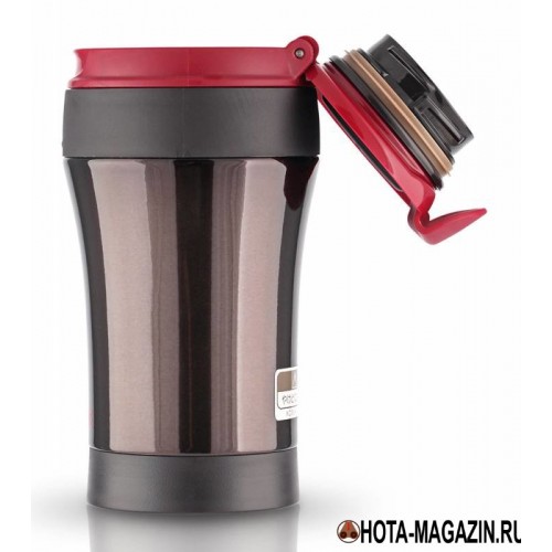 Термос-кружка для напитков. Крышка удерживается фиксатором в открытом положении. Корпус – нержавеющая сталь. Герметичная крышка на защелке. Широкое горлышко.