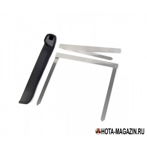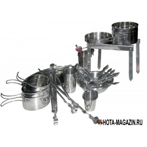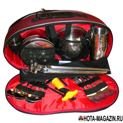 Состав набора: 3 котелка с боковыми ручками в чехле (объёмы - 1,2л. (с крышкой, на крышке ручка); 1л. (без крышки) ; 0,8л. (без крышки)), 5 ложек, 5 вилок, 5 рюмок, 5 кружек, 5 чашек, штопор, таганок "Рельсы" в чехле, поднос, 5 шампуров в чехле (длина 35см), фирменная сумка.