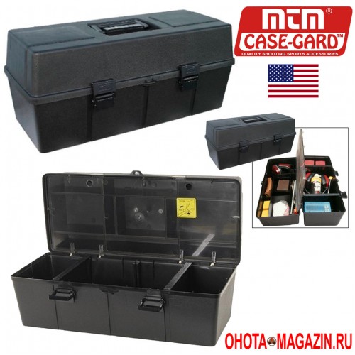 Ящик для патронов и снаряжения для охоты MTM Shooters Accessory Box отличное решение для хранения и перевозки боеприпасов и снаряжения для охоты, рыбалки или других целей. Ящик для патронов и снаряжения для охоты MTM Shooters Accessory Box создан и разработан профессиональными стрелками США и состоит из 2 частей верхнего пенала для аксессуаров и нижнего большого отсека для крупных вещей. Верхний пенал состоит из 8 отсеков и общей крышкой из прозрачного пластика. Нижняя часть это объемный отсек для крупного снаряжения, который при желании можно разделить на 3 части с помощью 2 съемных перегородокДно имеет 2 подвижных рассекателя которые можно аранжировать любой путь вы желаете. Ящик для патронов и снаряжения для охоты MTM Shooters Accessory Box сделан из прочного пластика и оборудован петлями из нержавеющей стали, двумя пластиковыми защелками, отверстием для пломб или навесного замка. Ящик для патронов и снаряжения для охоты MTM Shooters Accessory Box переносится за ручку, которая складывается внутрь при перевозке в багаже - экономия места в багажнике и защита от поломки. Ящик MTM Shooters Accessory Box рекомендуется использовать совместно с подставкой для чистки оружия MTM Portable Rifle Maintenance Center (габариты 59x28x9 см.), который устанавливается сверху и оборудован специальным проемом для ручки ящика.